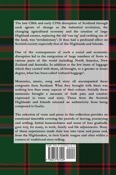 The late C18th and early C19th disruption of Scotland through such agents of change as the industrial revolution, the changing agricultural economy and the creation of large Highland estates, replacing the old 'run rig' and crofting use of the land, was 'revolutionary'. It thus had a profound effect on Scottish society especially that of the Highlands and Islands. One of the consequences of such a social and economic disruption led to the emigration of large numbers of Scots to various parts of the world including North America, New Zealand and Australia. In addition to the few items of luggage which they carried with them, all brought, to a greater or lesser degree, what has been called 'cultural baggage'. Memories, music, song and story all accompanied these emigrants from Scotland. What they brought with them was nothing less than many aspects of their culture. Initially these memories brought a measure of both pain and comfort expressed in verse and story. Those from the Scottish Highlands and Islands retained an authenticity from being composed in Gaelic. ¿ The selection of verse and prose in this collection provides an emotional timetable covering the periods of leaving, journeying and settling. Initial homesickness and sense of loss gradually gave way, for many, to work, family and life adjustments. Many of these experiences made their way into verse and prose and, from the Highlanders, in their Gaelic tongue and often within a context of traditional story-telling.