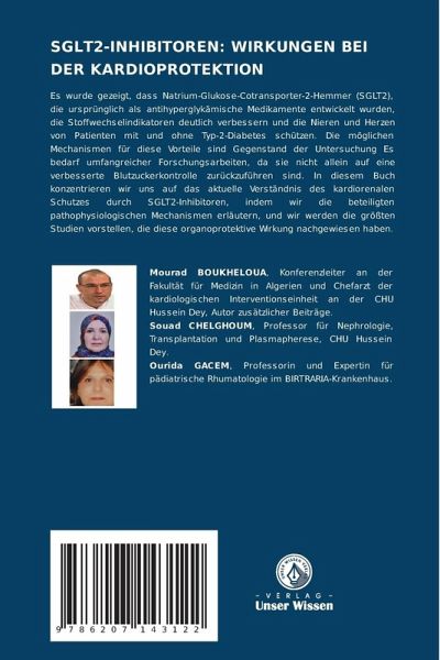 Es wurde gezeigt, dass Natrium-Glukose-Cotransporter-2-Hemmer (SGLT2), die ursprünglich als antihyperglykämische Medikamente entwickelt wurden, die Stoffwechselindikatoren deutlich verbessern und die Nieren und Herzen von Patienten mit und ohne Typ-2-Diabetes schützen. Die möglichen Mechanismen für diese Vorteile sind Gegenstand der Untersuchung Es bedarf umfangreicher Forschungsarbeiten, da sie nicht allein auf eine verbesserte Blutzuckerkontrolle zurückzuführen sind. In diesem Buch konzentrieren wir uns auf das aktuelle Verständnis des kardiorenalen Schutzes durch SGLT2-Inhibitoren, indem wir die beteiligten pathophysiologischen Mechanismen erläutern, und wir werden die größten Studien vorstellen, die diese organoprotektive Wirkung nachgewiesen haben.