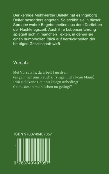 Der kernige Mühlviertler Dialekt hat es Ingeborg Reiter besonders angetan. So erzählt sie in dieser Sprache wahre Begebenheiten aus dem Dorfleben der Nachkriegszeit. Auch ihre Lebenserfahrung spiegelt sich in manchen Texten, in denen sie einen humorvollen Blick auf Verrücktheiten der heutigen Gesellschaft wirft.