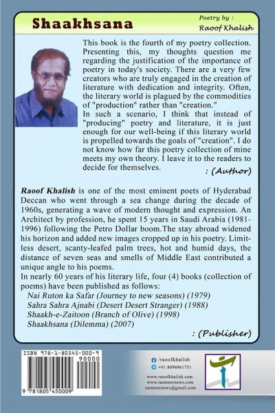 Raoof Khalish is one of the most eminent poets of Hyderabad Deccan who went through a sea change during the decade of 1960s, generating a wave of modern thought and expression. An Architect by profession, he spent 15 years in Saudi Arabia (1981-1996) following the Petro Dollar boom.The stay abroad widened his horizon and added new images cropped up in his poetry. Limitless desert, scanty-leafed palm trees, hot and humid days, the distance of seven seas and smells of Middle East contributed a unique angle to his poems. Shaakhsana is the fourth collection of his poetry. He thinksthat instead of "producing" poetry and literature, it is just enough for our well-being if this literary world is propelled towards the goals of "creation".