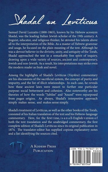 Samuel David Luzzatto (1800-1865), known by his Hebrew acronym Shadal, was the leading Italian Jewish scholar of the 19th century. A linguist, educator, and religious thinker, he devoted his talents above all to the interpretation of the Bible. As a master of Hebrew grammar and usage, he focused on the plain meaning of the text. Although he was a devout believer in the divinity, unity, and antiquity of the Torah, Shadal approached the text in a remarkably free spirit of inquiry, drawing upon a wide variety of sources, ancient and contemporary, Jewish and non-Jewish. As a result, his interpretations may strike even the modern reader as fresh and novel. Among the highlights of Shadal's Leviticus (Vayikra) commentary are his discussions of the sacrificial system, the concept of purity and impurity, and the list of illicit relationships. In each case, he reveals how these ancient laws were meant to further one particular purpose: social utility and cohesion. Also noteworthy are his theories of how the words "Jubilee" and "Azazel" were repurposed from pagan origins. As always, Shadal's interpretive approach simply makes sense, and makes sense simply. Shadal's treatment of Leviticus, as well as the other books of the Torah, consisted of his Italian translation of the text and his Hebrew-language commentary. Here, for the first time, is an all-English version of both the text translation and the unabridged commentary, the first complete edition of Shadal's Leviticus since its original publication in 1874. The translator-editor has supplied copious explanatory notes and a list identifying the sources cited.
