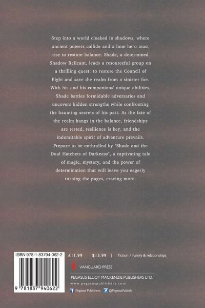 Step into a world cloaked in shadows, where ancient powers collide and a lone hero must rise to restore balance. Shade, a determined Shadow Relicant, leads a resourceful group on a thrilling quest: to restore the Council of Eight and save the realm from a sinister foe. With his and his companions' unique abilities, Shade battles formidable adversaries and uncovers hidden strengths while confronting the haunting secrets of his past. As the fate of the realm hangs in the balance, friendships are tested, resilience is key, and the indomitable spirit of adventure prevails. Prepare to be enthralled by "Shade and the Dual Hatchets of Darkness", a captivating tale of magic, mystery, and the power of determination that will leave you eagerly turning the pages, craving more.