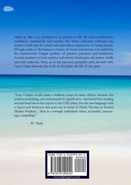 shades of blue is an invitation to be present to life. By turns mischievous, meditative, melancholy and ecstatic, this short collection celebrates the natural world and the mixed and marvellous experience of being human. Though shades of blue features a variety of forms and moods, it is unified by the characteristic Crispin qualities of passion, precision and tenderness. Acutely sensitive to both exterior and interior landscapes, she writes vividly and with authority. Here, as in her previous pamphlet wish you were here, Lucy Crispin honours the truth of the heart, the life of the spirit. "Lucy Crispin would make a brilliant scene-of-crime officer, because she notices everything, and understands its significance. And there'd be nothing second-hand about her report to the CID, either, for she uses language with a vigour and freshness that puts one in mind of Dylan Thomas or Gerard Manley Hopkins... Hers is a strongly individual vision, accessible, interesting, compelling." - RV Bailey