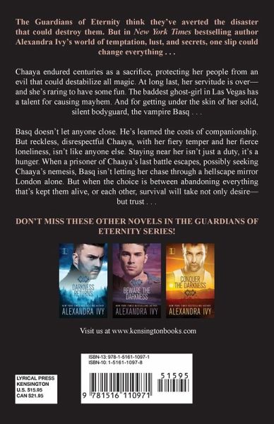 “Ripe with humor, romance, and the thrill of the chase…exciting.” —Publishers Weekly The Guardians of Eternity think they’ve averted the disaster that could destroy them. But in New York Times bestselling author Alexandra Ivy’s world of temptation, lust, and secrets, one slip could change everything . . . Chaaya endured centuries as a sacrifice, protecting her people from an evil that could destabilize all magic. At long last, her servitude is over—and she’s raring to have some fun. The baddest ghost-girl in Las Vegas has a talent for causing mayhem. And for getting under the skin of her solid, silent bodyguard, the vampire Basq . . .   Basq doesn’t let anyone close. He’s learned the costs of companionship. But reckless, disrespectful Chaaya, with her fiery temper and her fierce loneliness, isn’t like anyone else. Staying near her isn’t just a duty, it’s a hunger. When a prisoner of Chaaya’s last battle escapes, possibly seeking Chaaya’s nemesis, Basq isn’t letting her chase through a hellscape mirror London alone. But when the choice is between abandoning everything that’s kept them alive, or each other, survival will take not only desire—but trust . . .