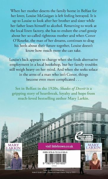 When her mother leaves the family home in Belfast for her lover, Louise McGuigan is left feeling betrayed. It is up to Louise to look after her brother and sister while her father loses himself to alcohol. Returning to work at the local linen factory, she has to endure the cruel gossip about her so-called righteous mother and when Conor O'Rourke, the man of her dreams, continues to drag his heels about their future together, Louise doesn't know how much more she can take. Louise's luck appears to change when she finds alternative employment in a local bookshop, but her family troubles still weigh heavy on her mind. And when she seeks solace in the arms of a man who isn't Conor, things become even more complicated. Can Louise find happiness with the right man or will she be tied to her troubled family for ever? Set in Belfast in the 1920s, Shades of Deceit is a gripping story of heartbreak, loyalty and hope from much-loved bestselling author Mary Larkin.