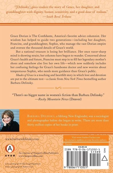 Grace Dorian is a national treasure. She is "The Confidante," a seasoned advice columnist whose practicality and good sense have guided two generations of American women in her syndicated daily column. Grace's daughter, Francine, and granddaughter, Sophie, manage the vast Dorian empire, overseeing Grace's speaking engagements, interviews, and demanding publicity schedules. But suddenly Grace does not seem right. Her razor-sharp mind is occasionally forgetful; her columns wander. Grace finds herself vehemently denying -- but is clearly suffering from -- the early symptoms of Alzheimer's disease. In a frantic struggle to regain control within the family and the business, Francine must step forth and fill her legendary mother's shoes. She must cope with Grace's mortal fear and inability to continue as "The Confidante," as well as her own new role of writing her mother's column, answering her fan mail and preserving the secret of her mother's health until Grace comes to terms with it herself. But Francine must also struggle to live her own life. Long divorced and existing in her mother's shadow, Francine battles her new role in the face of affections from Grace's doctor, a rugged and kind man whose interest leaves Francine torn between devotion to her mother and commitment to rebuilding her own life. And Francine must think of her daughter, Sophie, who at twenty-three needs Francine's guidance as much as, and perhaps more than, "The Confidante's" public does. Sophie watches the role reversal in her family and attempts to understand the drastic changes in a grandmother whom she has always loved but found overbearing. "Shades of Grace" is the most touching of family stories, inwhich love, family dysfunction and romance are woven together with brave and memorable characters to create a powerful narrative -- a talent that has earned Barbara Delinsky critical acclaim and an ever-widening readership.