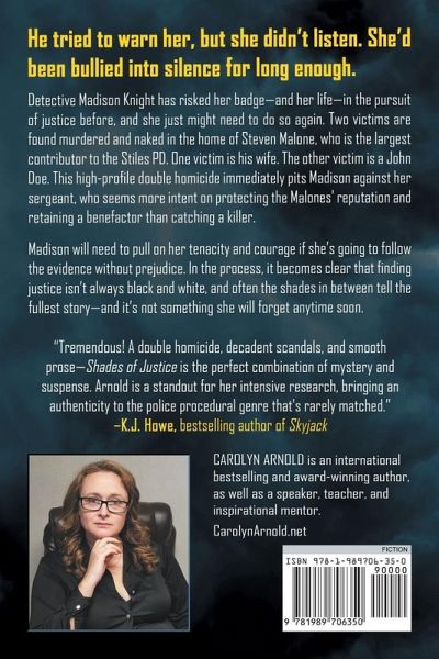She was tired of living a lie and wanted to know the truth about herself, about her past. But now she wished she'd never looked back... A high-profile double homicide immediately pits Detective Madison Knight against her sergeant. Both victims were found in the home of a prominent businessman. His wife is quickly identified as one of the deceased, but the man she was with is a John Doe. It has the makings of a scandal, but Madison's boss is determined that nothing gets out that will tarnish the family's reputation. Sergeant Winston doesn't even want her questioning the widower or his children. Winston's just concerned about protecting one of the largest financial contributors to the Stiles Police Department. Madison's not about to be swayed from finding the truth of what happened-even it means pushing against her superior's orders and risking suspension. After all, she's well aware that corruption exists within the Stiles PD, but she'd never suspected it might include her own sergeant-until now. As she continues the investigation, the man is identified and shocking family secrets come to light. Certainly, nothing was as it appeared, and it just may be that those who seem to have perfect lives are living the biggest lies of all. But if there's to be justice, Madison must push through all the obstacles hurled her way and never back down. Much easier said than done when her enemies will go to any measure to protect themselves and silence her. Shades of Justice is a murder mystery with twists and turns that will have readers flipping the pages until the wee hours of the morning. Perfect for fans of Rachel Caine, Lisa Regan and Robert Dugoni. Readers love Shades of Justice: "Tremendous! A double homicide, decadent scandals, and smooth prose-Shades of Justice is the perfect combination of mystery and suspense." -K.J. Howe, bestselling author of Skyjack "It was addictive, full of action and suspense, and it kept me on my toes guessing. It is the perfect book for all action/murder mystery fans. It is certainly worth the read!" - Goodreads Review, ¿¿¿¿¿ "There was plenty of action from start to finish and very fast-paced; it didn't take me long to get through the book once I started... I would highly recommend Shades of Justice and all the books in the Madison Knight series to anyone looking for a great crime thriller book." - Paperback Reading and More, ¿¿¿¿¿ "Madison Knight has her hands full in this nonstop action novel! Twists and turns galore in this murder mystery." - Miki's Hope, ¿¿¿¿¿