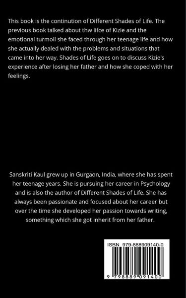 This book is the continution of Different Shades of Life. The previous book talked about thw lifce of Kizie and the emotional turmoil she faced through her teenage life and how she actually dealed with the problems and situations that came into her way. Shades of Life goes on to discuss Kizie's experience after losing her father and how she coped with her feelings.