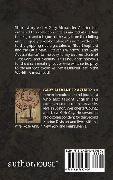 Short-story writer Gary Alexander Azerier has gathered this collection of tales and tidbits certain to delight and intrigue all the way from the chilling and uniquely spooky "Shade" and "Cordovan" to the gripping nostalgic tales of "Bob Shepherd and the Little Man," "Steven's Window," and "Auld Acquaintance" to the very funny but red alerts of "Password" and "Security." This singular anthology is for the discriminating reader who will also be privy to the author's exclusive "Most Difficult Test in the World!" A must-read!