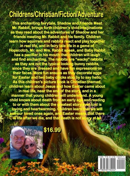 This enchanting fairy tale, Shadow and Friends Meet Mr. Rabbit, brings forth children's vivid imaginations as they read about the adventures of Shadow and her friends meeting Mr. Rabbit and his family. Children learn how squirrels and rabbits react and play together in real life, and in fairy tale life in a game of Hopscotch. Mr. and Mrs. Rabbit speak, and Baby Rabbit has a pacifier in his mouth that children will laugh and find enchanting. The rabbits are "wacky" rabbits as they are not the typical looking bunny rabbits, since they are dressed and have fun expressions on their faces. More fun ensues as they decorate eggs for Easter and two baby chicks stop by to say hello. As this children's picture book is Christian themed, children learn about Jesus and how Easter came about in real life, near the end of the story, and in a manner that young children will understand. A young child knows about death from an early age and reading to or with them about the greatest story ever told is loving and heartwarming. Children learn that we will see our loved ones again, and Easter means that there is life after we die, and that death is not scary at all.
