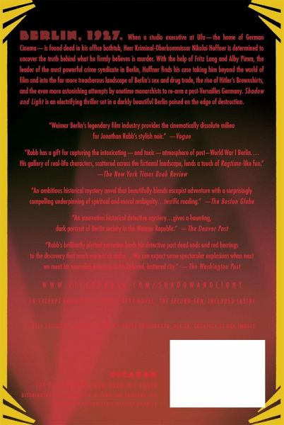 Berlin, 1927. When a studio executive at Ufa -- the home of German Cinema -- is found dead in his office bathtub, Herr Kriminal-Oberkommissar Nikolai Hoffner is determined to uncover the truth behind what he firmly believes is murder. With the help of Fritz Lang and Alby Pimm, the leader of the most powerful crime syndicate in Berlin, Hoffner finds his case taking him beyond the world of film and into the far more treacherous landscape of Berlin's sex and drug trade, the rise of Hitler's Brownshirts, and the even more astonishing attempts by onetime monarchists to rearm a post-Versailles Germany. Jonathan Rabb's Shadow and Light is an electrifying thriller set in a darkly beautiful Berlin poised on the edge of destruction.
