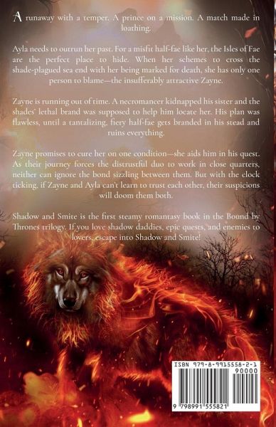 A runaway with a temper. A prince on a mission. A match made in loathing. Ayla needs to outrun her past. For a misfit half-fae like her, the Isles of Fae are the perfect place to hide. When her schemes to cross the shade-plagued sea end with her being marked for death, she has only one person to blame-the insufferably attractive Zayne. Zayne is running out of time. A necromancer kidnapped his sister and the shade's lethal brand was supposed to help him locate her. His plan was flawless, until a tantalizing, fiery half-fae gets branded in his stead and ruins everything. Zayne promises to cure her on one condition-she aids him in his quest. As their journey forces the distrustful duo to work in close quarters, neither can ignore the bond sizzling between them. But with the clock ticking, if Zayne and Ayla can't learn to trust each other, their suspicions will doom them both. Shadow and Smite is the first steamy romantasy book in the Bound by Thrones trilogy. If you love shadow daddies, epic quests, and enemies to lovers, escape into Shadow and Smite!