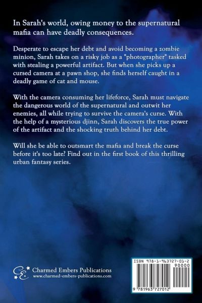 In Sarah's world, owing money to the supernatural mafia can have deadly consequences. Desperate to escape her debt and avoid becoming a zombie minion, Sarah takes on a risky job as a "photographer" tasked with stealing a powerful artifact. But when she picks up a cursed camera at a pawn shop, she finds herself caught in a deadly game of cat and mouse. With the camera consuming her lifeforce, Sarah must navigate the dangerous world of the supernatural and outwit her enemies, all while trying to survive the camera's curse. With the help of a mysterious djinn, Sarah discovers the true power of the artifact and the shocking truth behind her debt. Will she be able to outsmart the mafia and break the curse before it's too late? Find out in the first book of this thrilling urban fantasy series.