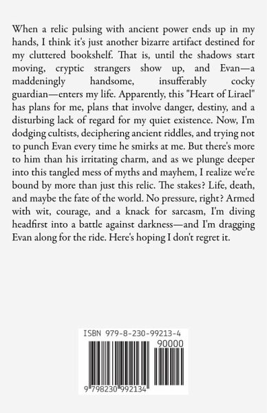 When a relic pulsing with ancient power ends up in my hands, I think it's just another bizarre artifact destined for my cluttered bookshelf. That is, until the shadows start moving, cryptic strangers show up, and Evan-a maddeningly handsome, insufferably cocky guardian-enters my life. Apparently, this "Heart of Lirael" has plans for me, plans that involve danger, destiny, and a disturbing lack of regard for my quiet existence. Now, I'm dodging cultists, deciphering ancient riddles, and trying not to punch Evan every time he smirks at me. But there's more to him than his irritating charm, and as we plunge deeper into this tangled mess of myths and mayhem, I realize we're bound by more than just this relic. The stakes? Life, death, and maybe the fate of the world. No pressure, right? Armed with wit, courage, and a knack for sarcasm, I'm diving headfirst into a battle against darkness-and I'm dragging Evan along for the ride. Here's hoping I don't regret it.