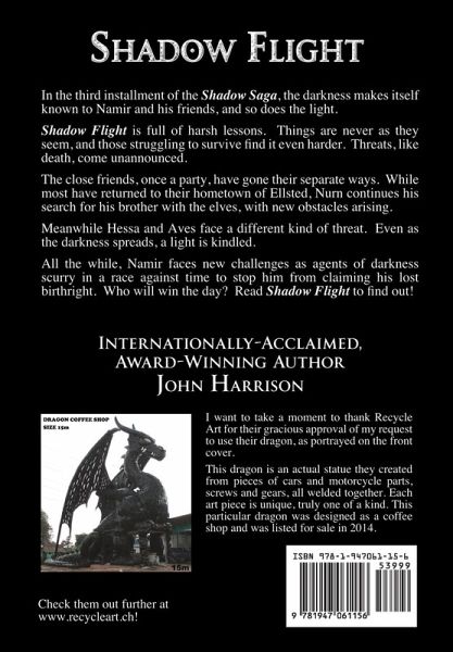 In Shadow Dance, the party of friends from Ellsted sought information about Narmir's heritage in Hornshir. In Shadow Play, Nurn searched for his little brother while the others continued to search. In this third installment of the Shadow Saga, the darkness makes itself known to Namir and his friends, and so will the light. Shadow Flight is full of harsh lessons. Things are never as they seem, and those struggling to survive find it even harder. Threats like death come unannounced. The party of friends has gone their separate ways. While most have returned to their hometown of Ellsted, Nurn continues his search for his brother with the elves, with new obstacles arising. Meanwhile Hessa and Aves face a different kind of threat. Even as the darkness spreads, a light is kindled. All the while, Namir faces new challenges as agents of darkness scurry in a race against time to stop him from claiming his lost birthright. Who will win the day? Read Shadow Flight to find out!
