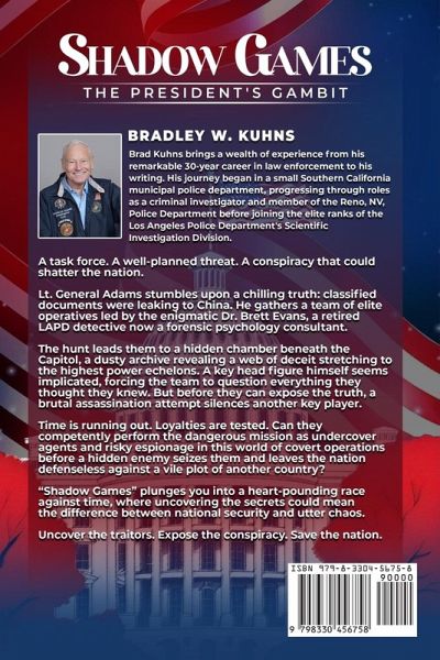 A task force. A well-planned threat. A conspiracy that could shatter the nation. Lt. General Adams stumbles upon a chilling truth: classified documents were leaking to China. He gathers a team of elite operatives led by the enigmatic Dr. Brett Evans, a retired LAPD detective now a forensic psychology consultant. The hunt leads them to a hidden chamber beneath the Capitol, a dusty archive revealing a web of deceit stretching to the highest power echelons. A key head figure himself seems implicated, forcing the team to question everything they thought they knew. But before they can expose the truth, a brutal assassination attempt silences another key player. Time is running out. Loyalties are tested. Can they competently perform the dangerous mission as undercover agents and risky espionage in this world of covert operations before a hidden enemy seizes them and leaves the nation defenseless against a vile plot of another country? "Shadow Games" plunges you into a heart-pounding race against time, where uncovering the secrets could mean the difference between national security and utter chaos. Uncover the traitors. Expose the conspiracy. Save the nation.