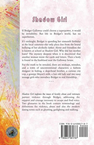 It's midnight. Bridget Galloway is spending her sixteenth birthday at the local cemetery-the only place free from the brutal bullying of her alcoholic father. Alone and friendless, in dark clothes with over-dyed black hair, she is Shadow Girl at school. Bridget misses her mother. Why did she leave? Where did she go? Leah Antoine, celebrity fashion designer, sits at Sydney airport having emptied the house she shared with her husband and put it up for sale. Dressed in drab clothes and wearing a messy brown wig Leah constantly looks over her shoulder. One more hour and she'll be free... A chance meeting brings these two together. Leah provides a refuge for Bridget. For family secrets to be revealed, there are mishaps, mistakes, and a town of unconventional characters: a curious city cop, a gossipy Mayor's wife, a lost old lady and two determined teenage girls who introduce Bridget to real friendship. Shadow Girl reaches honestly into the issues of family abuse and intimate partner violence, addressing the support and courage necessary to escape and find voice. Two glossaries in the book contain terminology and definitions for violence, abuse and also the modern dating terms such as ghosting, gaslighting and stalking.