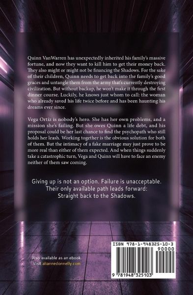 Quinn VanWarren has unexpectedly inherited his family's massive fortune, and now they want to kill him to get their money back. They also might or might not be financing the Shadows. For the sake of their children, Quinn needs to get back into the family's good graces and untangle them from the army that's currently destroying civilization. But without backup, he won't make it through the first dinner course. Luckily, he knows just whom to call: the woman who already saved his life twice before and has been haunting his dreams ever since. Vega Ortiz is nobody's hero. She has her own problems, and a mission she's failing. But she owes Quinn a life debt, and his proposal could be her last chance to find the psychopath who still holds her leash. Working together is the obvious solution for both of them. But the intimacy of a fake marriage may just prove to be more real than either of them expected. And when things suddenly take a catastrophic turn, Vega and Quinn will have to face an enemy neither of them saw coming. Giving up is not an option. Failure is unacceptable. Their only available path leads forward-straight back to the Shadows.