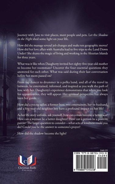 Journey with Jane to visit places, meet people and pets. Let the Shadow in the Night shed some light on your life. How did she manage several job changes and make ten geographic moves? How did her love affair with Australia lead to five trips to the Land Down Under? She shares the magic of living and working in the Aleutian Islands for three years. What was it like when Daugherty invited her eighty-five-year-old mother to become her roommate? Uncover the four essential questions they answered for each other. What was said during their last conversation before her mom passed on? From tap dancer to drummer in a polka band, and all of the travel in between, be entertained, informed, and inspired as you walk the path of love with her. Daugherty's experience demonstrates that when you look for opportunities, they will appear. Her spiritual perspective has always been her guide. How did a young sailor, a former boss, two entertainers, her ex-husband, and a five-year-old neighbor boy have a profound impact on her life? As her life story unfolds, ask yourself, how can a man become a better son? How can a woman be a better daughter? How can a person be a positive parent? The larger question to consider--what acts of kindness could you do? Could you be the answer to someone's prayer? How did the shadow become the light?