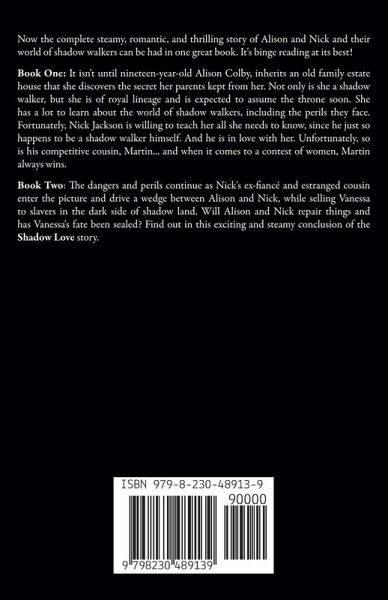 Now the complete steamy, romantic, and thrilling story of Alison and Nick and their world of shadow walkers can be had in one great book. It's binge reading at its best! Book One: It isn't until nineteen-year-old Alison Colby, inherits an old family estate house that she discovers the secret her parents kept from her. Not only is she a shadow walker, but she is of royal lineage and is expected to assume the throne soon. She has a lot to learn about the world of shadow walkers, including the perils they face. Fortunately, Nick Jackson is willing to teach her all she needs to know, since he just so happens to be a shadow walker himself. And he is in love with her. Unfortunately, so is his competitive cousin, Martin... and when it comes to a contest of women, Martin always wins. Book Two: The dangers and perils continue as Nick's ex-fiancé and estranged cousin enter the picture and drive a wedge between Alison and Nick, while selling Vanessa to slavers in the dark side of shadow land. Will Alison and Nick repair things and has Vanessa's fate been sealed? Find out in this exciting and steamy conclusion of the Shadow Love story.