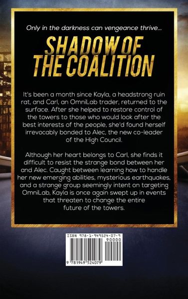 Only in the darkness can vengeance thrive… It's been a month since Kayla, a headstrong ruin rat, and Carl, an OmniLab trader, returned to the surface. After she helped to restore control of the towers to those who would look after the best interests of the people, she'd found herself irrevocably bonded to Alec, the new co-leader of the High Council. Although her heart belongs to Carl, she finds it difficult to resist the strange bond between her and Alec. Caught between learning how to handle her new emerging abilities, mysterious earthquakes, and a strange group seemingly intent on targeting OmniLab, Kayla is once again swept up in events that threaten to change the entire future of the towers.