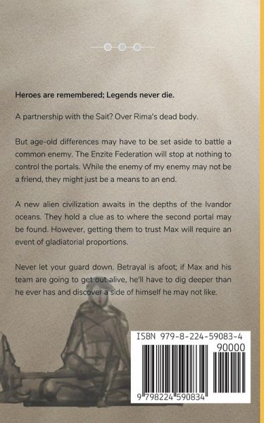 Heroes are Remembered, Legends Never Die. A partnership with the Sait? Over Rima's dead body. But age-old differences may have to be set aside to battle a common enemy. The Enzite Federation will stop at nothing to control the portals. While the enemy of my enemy may not be a friend they might just be a means to an end. A new alien species will be discovered in the depths of the Ivandor oceans. They hold a clue as to where the second portal may be found. However, getting them to trust Max will require an event of gladiatorial proportions. Never let your guard down. Betrayal is afoot; if Max and his team are going to get out alive, he'll have to dig deeper than he ever has and discover a side of himself he may not like.