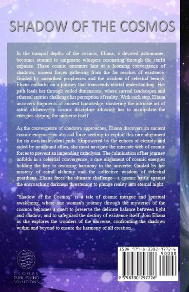 In the tranquil depths of the cosmos, Eliana, a devoted astronomer, becomes attuned to enigmatic whispers resonating through the starlit expanse. These cosmic murmurs hint at a looming convergence of shadows, unseen forces gathering from the far reaches of existence. Guided by unearthed prophecies and the wisdom of celestial beings, Eliana embarks on a journey that transcends mortal understanding. Her path leads her through veiled dimensions, where surreal landscapes and ethereal entities challenge her perception of reality. With each step, Eliana uncovers fragments of ancient knowledge, mastering the intricate art of astral alchemy-a cosmic discipline allowing her to manipulate the energies shaping the universe itself. As the convergence of shadows approaches, Eliana discovers an ancient cosmic enigma-an abyssal force seeking to exploit this rare alignment for its own malevolent ends. Empowered by the echoes of eternity and aided by newfound allies, she must navigate the intricate web of cosmic forces to prevent an impending cataclysm. The culmination of her journey unfolds in a celestial convergence, a rare alignment of cosmic energies holding the key to restoring harmony to the universe. Guided by her mastery of astral alchemy and the collective wisdom of celestial guardians, Eliana faces the ultimate challenge-a cosmic battle against the encroaching darkness threatening to plunge reality into eternal night. "Shadow of the Cosmos" is a tale of cosmic intrigue and spiritual awakening, where one woman's journey through the mysteries of the cosmos becomes a quest to preserve the delicate balance between light and shadow, and to safeguard the destiny of existence itself. Join Eliana as she explores the wonders of the universe, confronting the shadows within and beyond to ensure the harmony of all creation. "Shadow of the Cosmos" is a tale of cosmic intrigue and spiritual awakening, where one woman's journey through the mysteries of the cosmos becomes a quest to preserve the delicate balance between light and shadow, and to safeguard the destiny of existence itself. Join Eliana as she explores the wonders of the universe, confronting the shadows within and beyond to ensure the harmony of all creation.