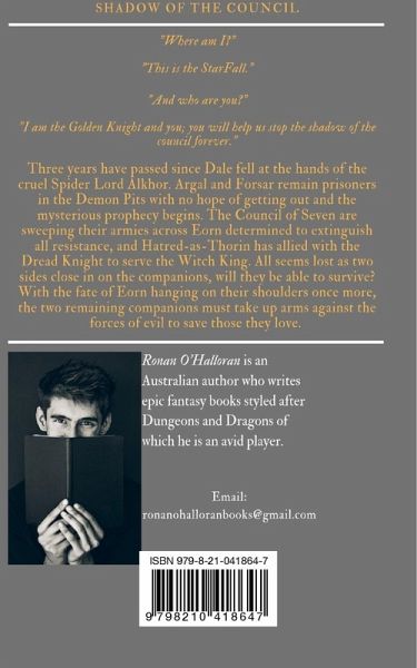 "Where am I?" "This is the StarFall." "And who are you?" "I am the Golden Knight and you; you will help us stop the shadow of the council forever." Three years have passed since Dale fell at the hands of the cruel Spider Lord Alkhor. Argal and Forsar remain prisoners in the Demon Pits with no hope of getting out and the mysterious prophecy begins. The Council of Seven are sweeping their armies across Eorn determined to extinguish all resistance, and Hatred-as-Thorin has allied with the Dread Knight to serve the Witch King. All seems lost as two sides close in on the companions, will they be able to survive? With the fate of Eorn hanging on their shoulders once more, the two remaining companions must take up arms against the forces of evil to save those they love.