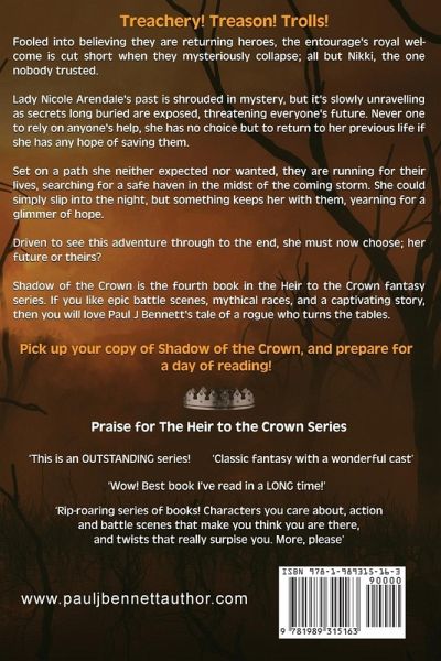 Treachery! Treason! Trolls! Fooled into believing they are returning heroes, the entourage's royal welcome is cut short when they mysteriously collapse; all but Nikki, the one nobody trusted. Lady Nicole Arendale's past is shrouded in mystery, but it's slowly unravelling as secrets long buried are exposed, threatening everyone's future. Never one to rely on anyone's help, she has no choice but to return to her previous life if she has any hope of saving them. Set on a path she neither expected nor wanted, they are running for their lives, searching for a safe haven in the midst of the coming storm. She could simply slip into the night, but something keeps her with them, yearning for a glimmer of hope. Driven to see this adventure through to the end, she must now choose; her future or theirs? Shadow of the Crown is the fourth book in the Heir to the Crown fantasy series. If you like epic battle scenes, mythical races, and a captivating story, then you will love Paul J Bennett's tale of a rogue who turns the tables. Pick up your copy of Shadow of the Crown, and prepare for a day of reading!