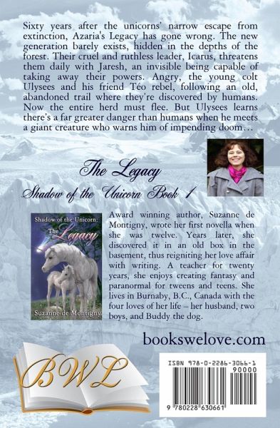 Sixty years after the unicorns' narrow escape from extinction, Azaria's Legacy has gone wrong. The new generation barely exists, hidden in the depths of the forest. Their cruel and ruthless leader, Icarus, threatens them daily with Jaresh, an invisible being capable of taking away their powers. Angry, the young colt Ulysees and his friend Téo rebel, following an old, abandoned trail where they're discovered by humans. Now the entire herd must flee. But Ulysees learns there's a far greater danger than humans when he meets a giant creature who warns him of impending doom... Editiorial Reviews Hats off to Suzanne de Montigny for giving us a book that boys, girls and their adult friends will all love. - S. Willet, author Ms. de Montigny excels at weaving a fantastical tale of adventure, bravery, friendship, mystery. The books carry an important anti-prejudicial theme (uncannily using unicorns) and never comes across as preachy. - Stuart R. West, author Suzanne de Montigny has written a lovely story of family and bravery. The unicorns can do magical things, but they also seem real, like flesh and blood animals. As much as I liked the first book in the series, this novel was even better. Even though it's written for children, I think all ages will enjoy reading THE SHADOW OF THE UNICORN II: THE DECEPTION. - Beverly McClure, author