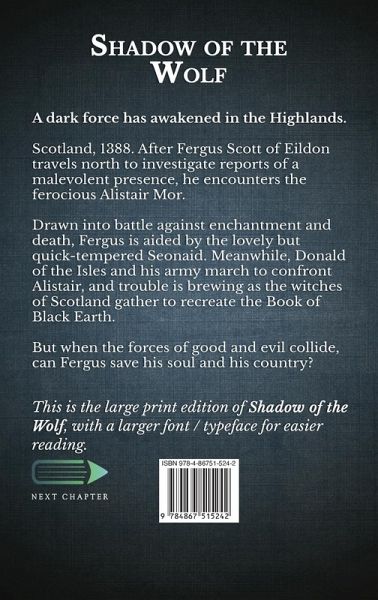 A dark force has awakened in the Highlands. Scotland, 1388. After Fergus Scott of Eildon travels north to investigate reports of a malevolent presence, he encounters the ferocious Alistair Mor. Drawn into battle against enchantment and death, Fergus is aided by the lovely but quick-tempered Seonaid. Meanwhile, Donald of the Isles and his army march to confront Alistair, and trouble is brewing as the witches of Scotland gather to recreate the Book of Black Earth. But when the forces of good and evil collide, can Fergus save his soul and his country? Inspired by the story of Alexander Stewart - The Wolf of Badenoch. ¿This is the large print edition of Shadow Of The Wolf, with a larger font / typeface for easier reading.
