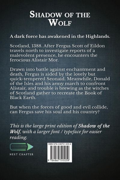 A dark force has awakened in the Highlands. Scotland, 1388. After Fergus Scott of Eildon travels north to investigate reports of a malevolent presence, he encounters the ferocious Alistair Mor. Drawn into battle against enchantment and death, Fergus is aided by the lovely but quick-tempered Seonaid. Meanwhile, Donald of the Isles and his army march to confront Alistair, and trouble is brewing as the witches of Scotland gather to recreate the Book of Black Earth. But when the forces of good and evil collide, can Fergus save his soul and his country? Inspired by the story of Alexander Stewart - The Wolf of Badenoch. This is the large print edition of Shadow Of The Wolf, with a larger font / typeface for easier reading.