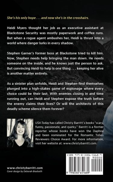She's his only hope . . . and now she's in the crosshairs. Heidi Myers thought her job as an executive assistant at Blackstone Security was mostly paperwork and coffee runs. But when a rogue agent ambushes her, Heidi is thrust into a world where danger lurks in every shadow. Stephen Garner's former boss at Blackstone tried to kill him. Now, Stephen needs help bringing the man down. He needs someone on the inside, and he knows just the person to ask. But convincing Heidi to help is one thing . . . keeping her alive is another matter entirely. As a sinister plan unfolds, Heidi and Stephen find themselves plunged into a high-stakes game of espionage where every choice could be their last. With enemies closing in and time running out, can Heidi and Stephen expose the truth before the enemy claims their lives? Or will the architects of this deadly scheme silence them forever?