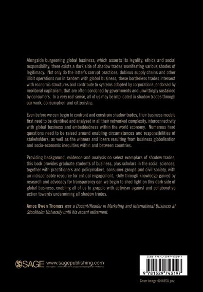 Alongside burgeoning global business, which asserts its legality, ethics and social responsibility, there exists a dark side of shadow trades manifesting various shades of legitimacy. Not only do the latter s corrupt practices, dubious supply chains and other illicit operations run in tandem with global business, these borderless trades intersect with economic structures and contribute to systems adopted by corporations, endorsed by neoliberal capitalism, that are often condoned by governments and unwittingly sustained by consumers. In a very real sense, all of us may be implicated in shadow trades through our work, consumption and citizenship.