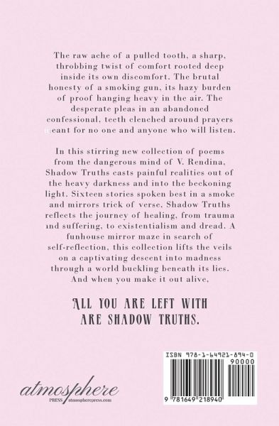The raw ache of a pulled tooth, a sharp, throbbing twist of comfort rooted deep inside its own discomfort. The brutal honesty of a smoking gun, its hazy burden of proof hanging heavy in the air. The desperate pleas in an abandoned confessional, teeth clenched around prayers meant for no one and anyone who will listen. In this stirring new collection of poems from the dangerous mind of V. Rendina, Shadow Truths casts painful realities out of the heavy darkness and into the beckoning light. Sixteen stories spoken best in a smoke and mirrors trick of verse, Shadow Truths reflects the journey of healing, from trauma and suffering, to existentialism and dread. A funhouse mirror maze in search of self-reflection, this collection lifts the veils on a captivating descent into madness through a world buckling beneath its lies. And when you make it out alive, ALL YOU ARE LEFT WITH ARE SHADOW TRUTHS.