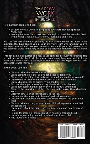 Two manuscripts in one book:Shadow Work: A Guide to Integrating Your Dark Side for Spiritual Awakening Healing the Inner Child: How You Can Begin to Heal the Wounded Soul Within Using Meditation, Awareness, Journaling, and More With the first part of the book pointing the way, you'll discover the secret to the questions that have eluded you all your life. You'll learn why (and how) you've sabotaged yourself and how you can make peace with your dark passenger so you can both cruise to the very heights of life that your authentic self was made for. Through its helpful quizzes and easy-to-use spiritual discovery techniques, this second part of this book will help you reveal everything you need to know about your inner child - including how to make this child happy and use their happiness to heal your soul. In this book, you will:Discover what the shadow means Learn about the fact that you've got a shadow tailing you Discover all the things that make up the shadowy version of yourself Understand its place within the process of spiritual awakening Learn what it means to discover your shadow Find out the importance of making friends with your shadow Learn how accepting the shadow key is to spiritual awakening Discover the importance of the reflection in the mirror through mirror work Discover how to bring your shadow to the light Learn about the important phases of spiritual awakening Uncover the connection between your soul's wounds and your inner child Discover which archetype your inner child belongs to and what their challenges are Learn more about the nature of your inner child and how to accept them Realize the impact of mediation when healing a wounded soul Learn how journaling can help you heal your inner child And much, much more!