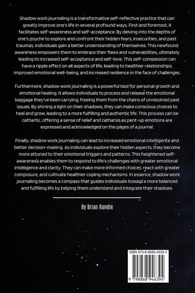 Shadow work journaling is a transformative self-reflective practice that can greatly improve one's life in several profound ways. First and foremost, it facilitates self-awareness and self-acceptance. By delving into the depths of one's psyche to explore and confront their hidden fears, insecurities, and past traumas, individuals gain a better understanding of themselves. This newfound awareness empowers them to embrace their flaws and vulnerabilities, ultimately leading to increased self-acceptance and self-love. This self-compassion can have a ripple effect on all aspects of life, leading to healthier relationships. improved emotional well-being, and increased resilience in the face of challenges. Furthermore, shadow work journaling is a powerful tool for personal growth and emotional healing. It allows individuals to process and release the emotional baggage they've been carrying, freeing them from the chains of unresolved past issues. By shining a light on their shadows, they can make conscious choices to heal and grow, leading to a more fulfilling and authentic life. This process can be cathartic, offering a sense of relief and catharsis as pent-up emotions are expressed and acknowledged on the pages of a journal. Finally, shadow work journaling can lead to increased emotional intelligente and better decision-making. As individuals explore their hidden aspects, they become more attuned to their emotional triggers and patterns. This heightened self- awareness enables them to respond to life's challenges with greater emotional intelligence and clarity. They can make more informed choices, react with greater composure, and cultivate healthier coping mechanisms. In essence, shadow work Journaling becomes a compass that guides individuals toward a more balanced and fulfilling life by helping them understand and integrate their shadows.