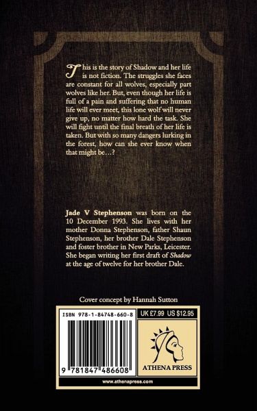 This is the story of Shadow and her life is not fiction. The struggles she faces are constant for all wolves, especially part wolves like her. But, even though her life is full of a pain and suffering that no human life will ever meet, this lone wolf will never give up, no matter how hard the task. She will fight until the final breath of her life is taken. But with so many dangers lurking in the forest, how can she ever know when that might be...? AUTHOR BIO: Jade V Stephenson was born on the 10 December 1993. She lives with her mother Donna Stephenson, father Shaun Stephenson, her brother Dale Stephenson and foster brother in New Parks, Leicester. She began writing her first draft of Shadow at the age of twelve for her brother Dale.