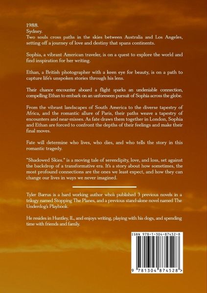 1988. Sydney. Two souls cross paths in the skies between Australia and Los Angeles, setting off a journey of love and destiny that spans continents. Sophia, a vibrant American traveler, is on a quest to explore the world and find inspiration for her writing. Ethan, a British photographer with a keen eye for beauty, is on a path to capture life's unspoken stories through his lens. Their chance encounter aboard a flight sparks an undeniable connection, compelling Ethan to embark on an unforeseen pursuit of Sophia across the globe. From the vibrant landscapes of South America to the diverse tapestry of Africa, and the romantic allure of Paris, their paths weave a tapestry of encounters and near-misses. As fate draws them together in London, Sophia and Ethan are forced to confront the depths of their feelings and make their final moves. Fate will determine who lives, who dies, and who tells the story in this romantic tragedy. "Shadowed Skies." is a moving tale of serendipity, love, and loss, set against the backdrop of a transformative era. It's a story about how sometimes, the most profound connections are the ones we least expect, and how they can change our lives in ways we never imagined.