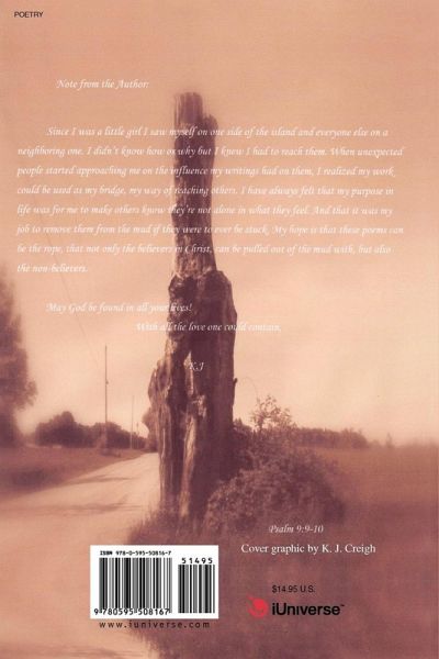 Note from the Author: Since I was a little girl I saw myself on one island and everyone else on a neighboring one. I didn't know how or why but I knew I had to reach them. When unexpected people started approaching me on the influence my writings had on them, I realized my work could be used as my bridge, my way of reaching others. I have always felt that my purpose in life was for me to make others know they're not alone in what they feel. And that it was my job to remove them from the mud if they were to ever be stuck. My hope is that these poems can be the rope, that not only the believers in Christ, can be pulled out of the mud with, but also the non-believers. May God be found in all your lives! With all the love one could contain, K.J Psalm 9:9-10