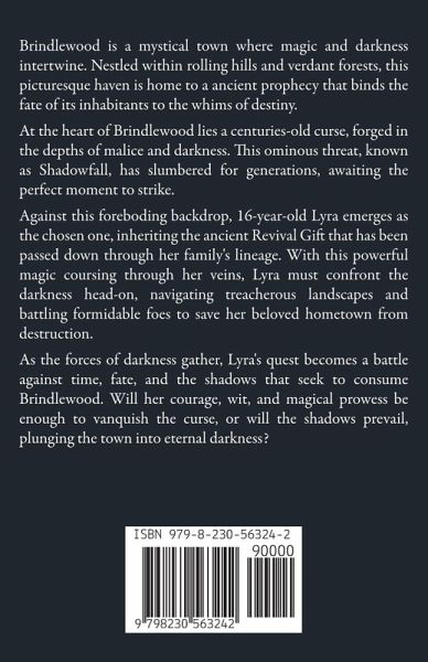 Brindlewood is a mystical town where magic and darkness intertwine. Nestled within rolling hills and verdant forests, this picturesque haven is home to a ancient prophecy that binds the fate of its inhabitants to the whims of destiny. At the heart of Brindlewood lies a centuries-old curse, forged in the depths of malice and darkness. This ominous threat, known as Shadowfall, has slumbered for generations, awaiting the perfect moment to strike. Against this foreboding backdrop, 16-year-old Lyra emerges as the chosen one, inheriting the ancient Revival Gift that has been passed down through her family's lineage. With this powerful magic coursing through her veins, Lyra must confront the darkness head-on, navigating treacherous landscapes and battling formidable foes to save her beloved hometown from destruction. As the forces of darkness gather, Lyra's quest becomes a battle against time, fate, and the shadows that seek to consume Brindlewood. Will her courage, wit, and magical prowess be enough to vanquish the curse, or will the shadows prevail, plunging the town into eternal darkness?