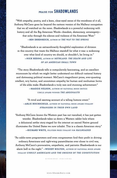 Los Angeles Times Bestseller An "epic exploration" of the 2016 right-wing Oregon Occupation-"an excellent microcosm by which we might better understand our difficult national history and distressing political moment" (Maggie Nelson). In 2016, a group of armed, divinely inspired right-wing protestors led by Ammon Bundy occupied the Malheur National Wildlife Refuge in the high desert of eastern Oregon. Encamped in the shadowlands of the republic, insisting that the Federal government had no right to own public land, the occupiers were seen by a divided country as either dangerous extremists dressed up as cowboys, or as heroes insisting on restoring the rule of the Constitution. From the Occupation's beginnings, to the trials of the occupiers in federal court in downtown Portland and their tumultuous aftermaths, Shadowlands is the resonant, multifaceted story of one of the most dramatic flashpoints in the year that gave us Donald Trump. Sharing the expansive stage with the occupiers are a host of others-Native American tribal leaders, public-lands ranchers, militia members, environmentalists, federal defense attorneys, and Black Lives Matter activists-each contending in their different ways with the meaning of the American promise of Liberty. Gathering into its vortex the realities of social media technology, history, religion, race, and the environment-this piercing work by Anthony McCann offers us a combination of beautiful writing and high-stakes analysis of our current cultural and political moment. Shadowlands is a clarifying, exhilarating story of a nation facing an uncertain future and a murky past in a time of great collective reckoning.