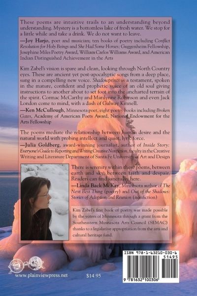 These poems are intuitive trails to an understanding beyond understanding. Mystery is a bottomless lake of fresh water. We stop for a little while and take a drink. We do not want to leave. -Joy Harjo, poet and musician; ten poetry books including Conflict Resolution for Holy Beings and She Had Some Horses; Guggenheim Fellowship, Josephine Miles Poetry Award, William Carlos Williams Award, and American Indian Distinguished Achievement in the Arts Kim Zabel's vision is spare and clean, looking through North Country eyes. These are ancient yet post-apocalyptic songs from a deep place, sung in a compelling new voice. Shadowprints is a testament, spoken in the mature, confident and prophetic voice of an old soul giving instructions to another about to set foot into the uncharted terrain of the spirit. Cormac McCarthy and Marilynne Robinson and even Jack London come to mind, with a dash of Galway Kinnell. -Ken McCullough, Minnesota poet, eight poetry books including Broken Gates, Academy of American Poets Award, National Endowment for the Arts Fellowship The poems mediate the relationship between human desire and the natural world with probing intellect and quiet, lyric force. -Julia Goldberg, award-winning journalist and author of Inside Story: Everyone's Guide to Reporting and Writing Creative Nonfiction, faculty in the Creative Writing and Literature Department of Santa Fe University of Art and Design There is serenity within these poems, between earth and sky, between faith and despair. Readers can find sanctuary here. -Linda Back McKay, Minnesota author of The Next Best Thing (poetry) and Out of the Shadows: Stories of Adoption and Reunion (nonfiction) Kim Zabel's first book of poetry was made possible by the voters of Minnesota through a grant from the Southeastern Minnesota Arts Council (SEMAC) thanks to a legislative appropriation from the arts and cultural heritage fund.
