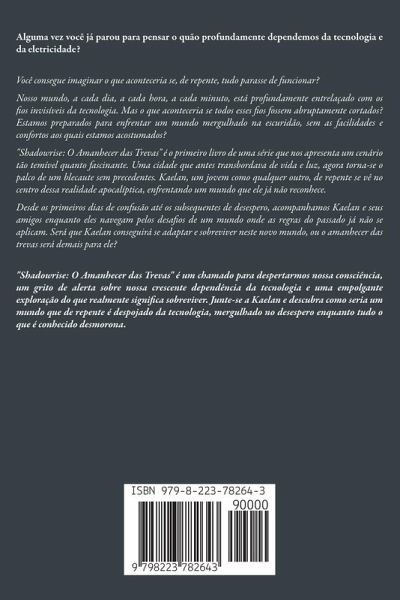 Alguma vez você já parou para pensar o quão profundamente dependemos da tecnologia e da eletricidade? Você consegue imaginar o que aconteceria se, de repente, tudo parasse de funcionar? Nosso mundo, a cada dia, a cada hora, a cada minuto, está profundamente entrelaçado com os fios invisíveis da tecnologia. Mas o que aconteceria se todos esses fios fossem abruptamente cortados? Estamos preparados para enfrentar um mundo mergulhado na escuridão, sem as facilidades e confortos aos quais estamos acostumados? "Shadowrise: O Amanhecer das Trevas" é o primeiro livro de uma série que nos apresenta um cenário tão temível quanto fascinante. Uma cidade que antes transbordava de vida e luz, agora torna-se o palco de um blecaute sem precedentes. Kaelan, um jovem como qualquer outro, de repente se vê no centro dessa realidade apocalíptica, enfrentando um mundo que ele já não reconhece. Desde os primeiros dias de confusão até os subsequentes de desespero, acompanhamos Kaelan e seus amigos enquanto eles navegam pelos desafios de um mundo onde as regras do passado já não se aplicam. Será que Kaelan conseguirá se adaptar e sobreviver neste novo mundo, ou o amanhecer das trevas será demais para ele? "Shadowrise: O Amanhecer das Trevas" é um chamado para despertarmos nossa consciência, um grito de alerta sobre nossa crescente dependência da tecnologia e uma empolgante exploração do que realmente significa sobreviver. Junte-se a Kaelan e descubra como seria um mundo que de repente é despojado da tecnologia, mergulhado no desespero enquanto tudo o que é conhecido desmorona.