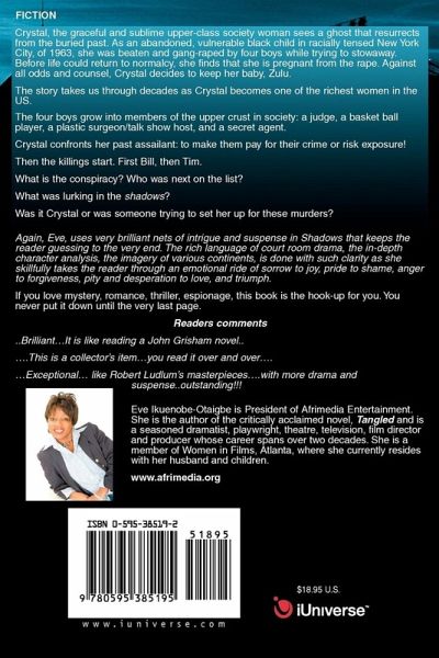 Crystal, the graceful and sublime upper-class society woman sees a ghost that resurrects from the buried past. As an abandoned, vulnerable black child in racially tensed New York City, of 1963, she was beaten and gang-raped by four boys while trying to stowaway. Before life could return to normalcy, she finds that she is pregnant from the rape. Against all odds and counsel, Crystal decides to keep her baby, Zulu. The story takes us through decades as Crystal becomes one of the richest women in the US. The four boys grow into members of the upper crust in society: a judge, a basket ball player, a plastic surgeon/talk show host, and a secret agent. Crystal confronts her past assailant: to make them pay for their crime or risk exposure! Then the killings start. First Bill, then Tim. What is the conspiracy? Who was next on the list? What was lurking in the shadows? Was it Crystal or was someone trying to set her up for these murders? Again, Eve, author of the critically- acclaimed novel, Tangled, uses very brilliant nets of intrigue and suspense in Shadows that keeps the reader guessing to the very end. The rich language of court room drama, the in-depth character analysis, the imagery of various continents, is done with such clarity as she skillfully takes the reader through an emotional ride of sorrow to joy, pride to shame, anger to forgiveness, pity and desperation to love, and triumph. If you love mystery, romance, thriller, espionage, this book is the hook-up for you. You never put it down until the very last page. Readers comments ..Brilliant.It is like reading a John Grisham novel.. ..This is a collector's item.you read it over and over.. .Exceptional. like Robert Ludlum's masterpieces..with more drama and suspense..outstanding!!!