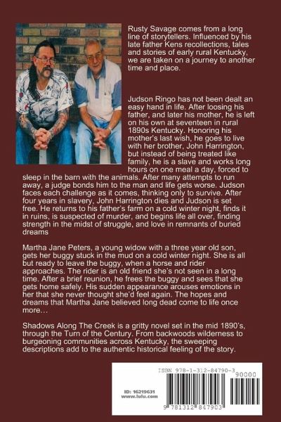 Shadows Along The Creek is a gritty and exciting novel. From the late 1890's, through the Turn of the Century, Judson Ringo suffers and triumphs across family lines and a victim of circumstance. From the backwoods wilderness to burgeoning communities across the Kentucky landscape. Sweeping descriptions of scenery add to the authentic historical feeling of the story. Judson and Martha are traditionally motivated and encumbered by time and circumstance. The romance that develops between them is deep and consuming. The story weaves the reader through a tapestry of fact and fiction, an epic novel sweeps us into a time and place and into a breathtaking story of love and survival in a land and time long past.