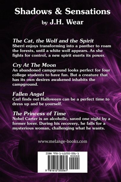 Shadows & Sensations By J.H. Wear The Cat, the Wolf and the Spirit Sherri enjoys transforming into a panther to roam the forests, until a white wolf appears. As she fights for control, a new spirit exerts its power. Cry At The Moon An abandoned campground looks perfect for four college students to have fun. But a creature that has its own desires awakened inhabits the campground. Fallen Angel Carl finds out Halloween can be a perfect time to dress up and be yourself. The Princess of Time Nobel Carter is an alcoholic, saved one night by a former lover. During his recovery, he falls for a mysterious woman, challenging what he wants.