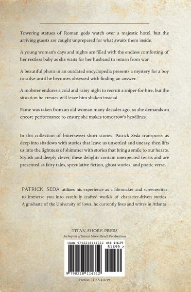 In this collection of bittersweet short stories, Patrick Seda transports us deep into shadows with stories that leave us unsettled and uneasy, then lifts us into the lightness of shimmer with stories that bring a smile to our hearts. Stylish and deeply clever, these delights contain unexpected twists and are presented as fairy tales, speculative fiction, ghost stories, and poetic verse.