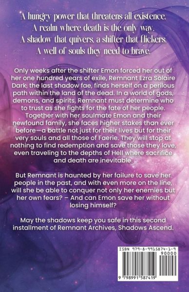 Only weeks after the shifter Emon forced her out of her one hundred years of exile, Remnant Ezra Solaire Dark, the last shadow fae, finds herself on a perilous path within the land of the dead. In a world of gods, demons, and spirits, Remnant must determine who to trust as she fights for the fate of her people. Together with her soulmate Emon and their newfound family, she faces higher stakes than ever before-a battle not just for their lives but for their very souls and all those of Faerie. They will stop at nothing to find redemption and save those they love, even traveling to the depths of Hell where sacrifice and death are inevitable. But Remnant is haunted by her failure to save her people in the past, and with even more on the line, will she be able to conquer not only her enemies but her own fears? - And can Emon save her without losing himself? May the shadows keep you safe in this second installment of Remnant Archives, Shadows Ascend.