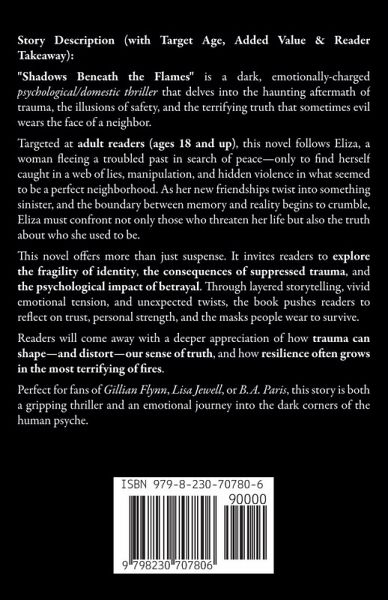 Story Description (with Target Age, Added Value & Reader Takeaway): "Shadows Beneath the Flames" is a dark, emotionally-charged psychological/domestic thriller that delves into the haunting aftermath of trauma, the illusions of safety, and the terrifying truth that sometimes evil wears the face of a neighbor. Targeted at adult readers (ages 18 and up), this novel follows Eliza, a woman fleeing a troubled past in search of peace-only to find herself caught in a web of lies, manipulation, and hidden violence in what seemed to be a perfect neighborhood. As her new friendships twist into something sinister, and the boundary between memory and reality begins to crumble, Eliza must confront not only those who threaten her life but also the truth about who she used to be. This novel offers more than just suspense. It invites readers to explore the fragility of identity, the consequences of suppressed trauma, and the psychological impact of betrayal. Through layered storytelling, vivid emotional tension, and unexpected twists, the book pushes readers to reflect on trust, personal strength, and the masks people wear to survive. Readers will come away with a deeper appreciation of how trauma can shape-and distort-our sense of truth, and how resilience often grows in the most terrifying of fires. Perfect for fans of Gillian Flynn, Lisa Jewell, or B.A. Paris, this story is both a gripping thriller and an emotional journey into the dark corners of the human psyche.